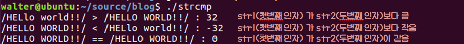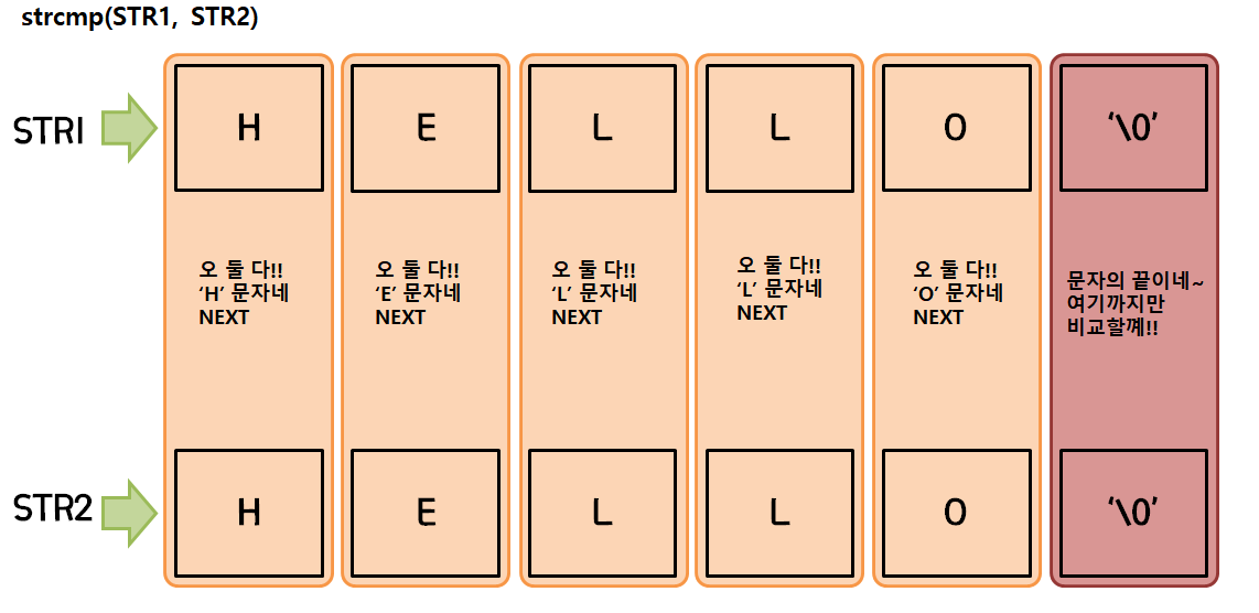위에서 설명드렸다시피 strcmp() 함수는 str1, str2문자열에서 '\0' 문자를 찾아 비교할 크기를 찾고 비교를 시작합니다.