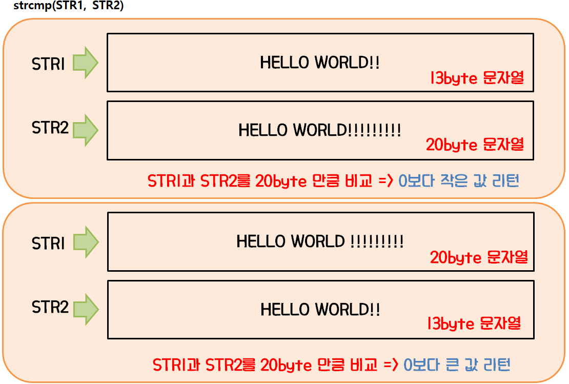 예를들면 str1 문자열의 길이가 13byte 이고 str2 문자열의 길이가 20byte이면 20byte까지 문자열을 비교하게 됩니다.