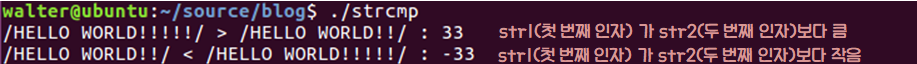 아래의 그림에서 처럼 13byte까지는 "HELLO WORLD!!"는 동일하고 다음 14byte를 비교할때 str1의 '\0' 과 str2의 '!' 문자를 비교하게 되어 '!' 문자열이 더 크다는 결과가 나옵니다.